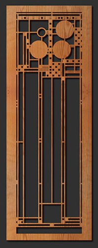This design is an adaptation from a section of the colorful art glass window triptych found in the Avery Coonley Playhouse, designed by Frank Lloyd Wright.